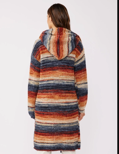 This novelty space-dye hooded cardigan coat blends rich rust and navy hues in a unique multicolored pattern. Crafted for versatile layering, its lightweight design offers warmth without bulk, while the hood provides added protection against cool weather. Ideal for elevating casual outfits, this cardigan coat combines comfort and style with expert color interplay and a relaxed fit.